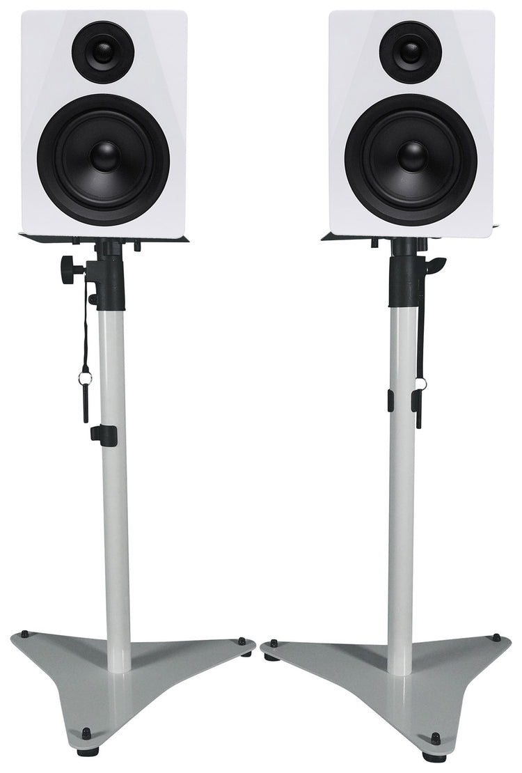 5.25" Powered Monitors, 2 Speakers, White Height‑Adjustable Stands, Elegant Studio Setup
