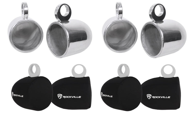 Create a striking four-pod silver setup with waterproof enclosures and protective neoprene covers. Internal wiring preserves the clean lines and shields connections, while universal clamps and inserts fit 2"–2.5" bars. The covers defend against spray, sun, and trail wear, keeping your equipment looking fresh while sound stays bold and clear from dock to deep water.