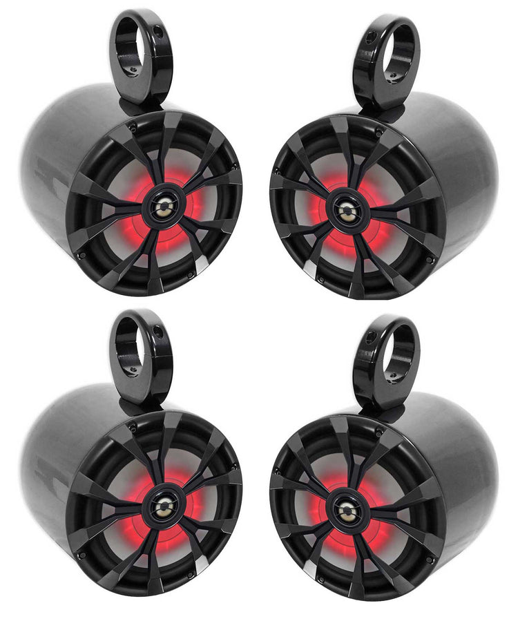 8" Marine Tower Speaker Set, 4x LED Coaxials, 7.7" Black Aluminum Wake Cans