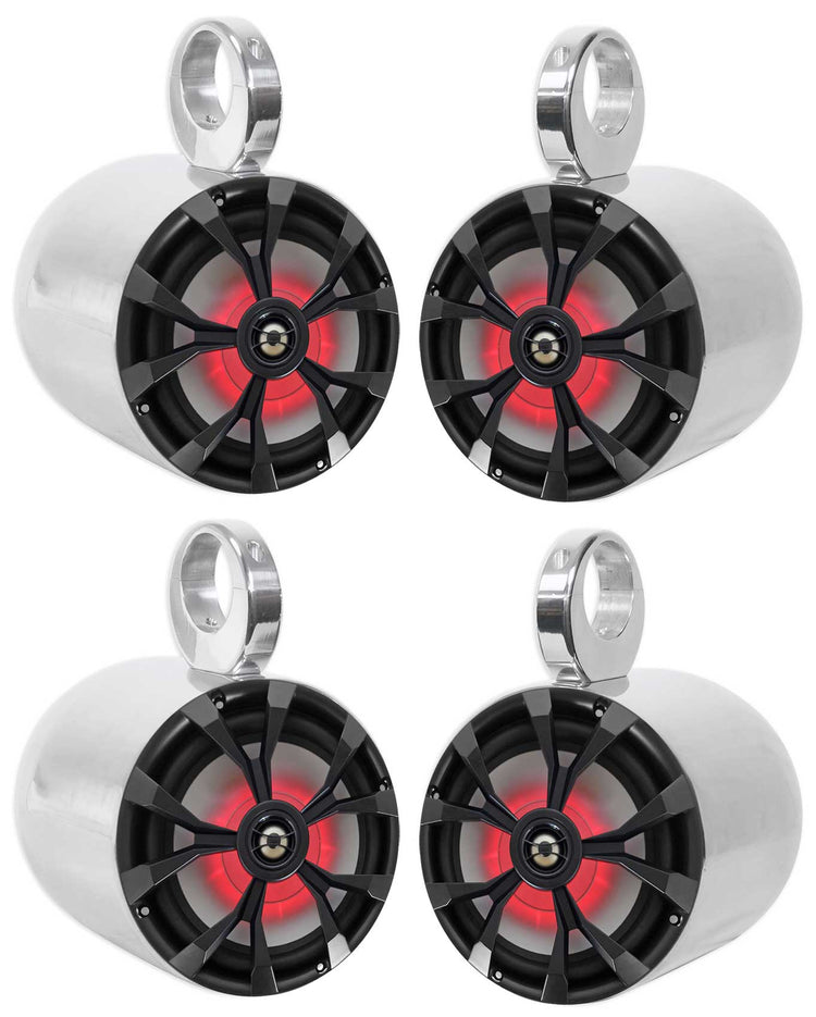 8" Marine Tower Speaker Set, 4x LED Coaxials, Polished Aluminum Wake Cans