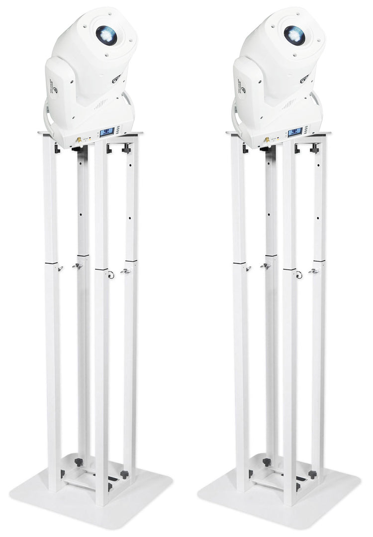 Command attention with towering presentation and refined beams. This bundle pairs bright moving heads—featuring gobos, color wheel, and rotating prism—with 8' white totems for striking vertical presence. Ideal for grand ballrooms, stages, and high-ceiling venues, the system assembles quickly, keeps cables concealed, and delivers a sophisticated aesthetic that complements modern event design.