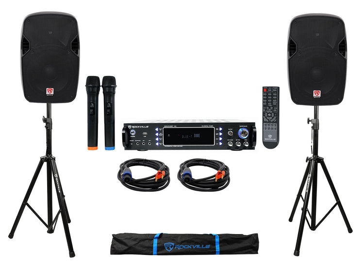 12" Passive PA Speakers, 2-Pack, 1,000W BT Mixer/Amp, Stands, 20' Cables, Dual Mics