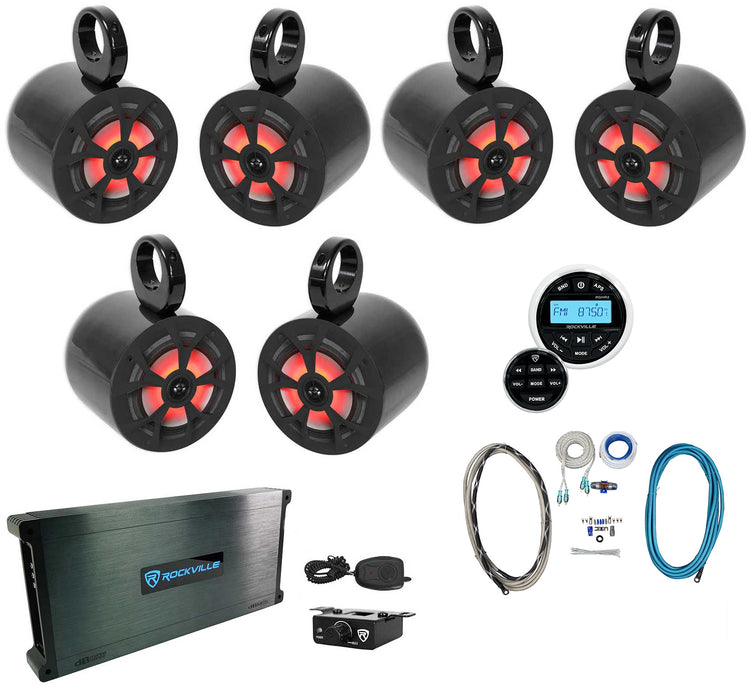 8" LED Marine Speakers 200W RMS Each, 6‑Pack, 6‑Ch Marine Amp, Tower Cans, 4 AWG Kit