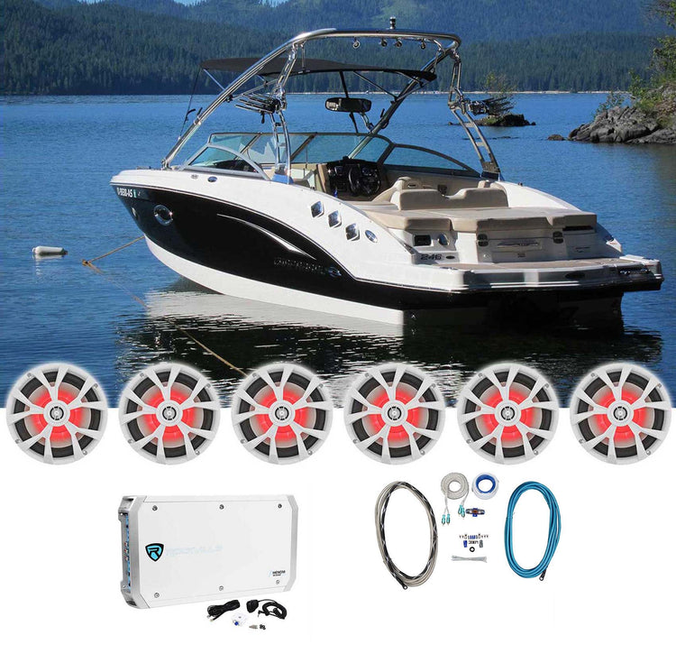 8" Marine Speaker Package, 6x White LED Coaxials, 6-Channel Amp, 4 AWG Wiring Kit