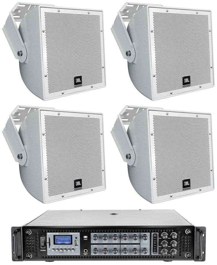 (4) JBL AWC82 8" 200w Indoor/Outdoor 70V Surface Mount Commercial Speakers+Amp