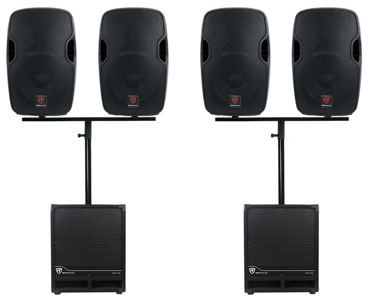 Powered 12" PA Speakers, 4-Pack, Dual Mount Bars, (2) 36" Poles, (2) 12" Powered Subs
