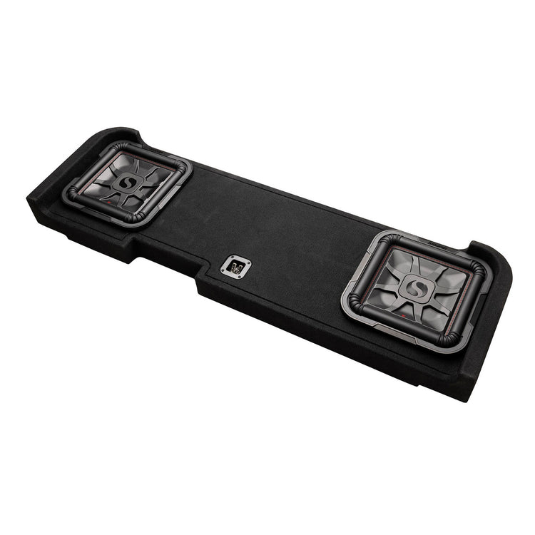 This dual 12" thin sub enclosure is shaped to disappear under the rear seat yet deliver commanding low end. With 1,200W RMS power handling at 2Ω and down‑firing design, it preserves legroom while filling the cab with tight, musical bass. Thick MDF, heavy bracing, and durable carpeting support daily use. Tuned by acoustic engineers, the square cones move more air than round subs for greater output in the same footprint. A smart solution for Silverado and Sierra crew cab owners seeking clean installation, deep response, and confident performance without sacrificing space.