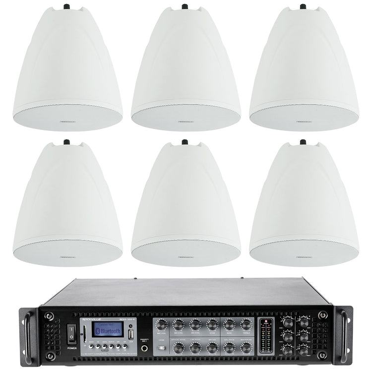 6.5" 70V Pendant Speakers, White, 6 Units, Stereo 6-Zone 320W Amp, Hanging Hardware