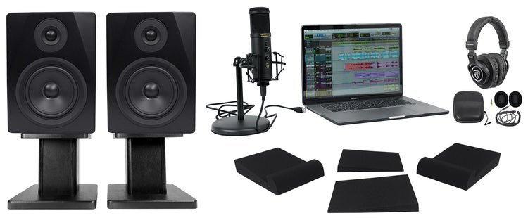 Studio Monitors 5.25" Bi‑Amp, 1‑Pack, USB Mic Interface, Headphones, Desktop Stands, Pads