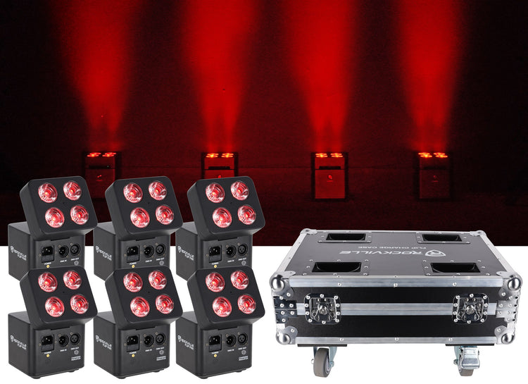 This touring‑ready lighting pack pairs six ultra‑bright RGBWA+UV battery pars with a rugged charging road case. The unique flip‑angle head locks instantly for precise 15° beams, while aluminum housing and hidden LCD keep the look refined. Control via wireless DMX, redesigned IR remote, or iOS/Android app with 4 groups—perfect for fast room washes, dance floors, and stages. Big batteries run up to 18 hours on a single color, and selectable color wheels speed scene creation. The rolling case stores remotes and cables and charges all six at once.