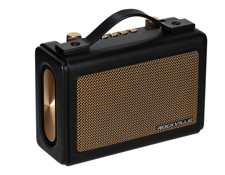 - Type Retro Style Portable Bluetooth Speaker Color Black and Gold Power Output 25 Watts (2 x 10W Full-Range + 5W Tweeter) Speaker Setup (2) 2.5" Full-Range Drivers, (1) 1.5" Tweeter, (2) Passive Radiators Bluetooth Version 5.4 Bluetooth Range Up to 40 feet Playback Options Bluetooth, USB, TF Card, 3.5mm Aux, USB Audio Supported File Types MP3, MP4, WMA, FLAC, WAV Max SPL 80dB at 3 meters Frequency Response 62Hz – 18kHz @ -10dB / 70Hz – 18kHz @ -3dB Battery 4000mAh (3.7V) Battery Life Up to 18 hours (low volume), 5.3 hours (max volume) Charge Time 5.5 hours (0 to 100%) Handle Material PU Leather Dimensions (inches) 8.66” L x 3.66” W x 6.29” H (5” without handle) Weight 2.57 lb