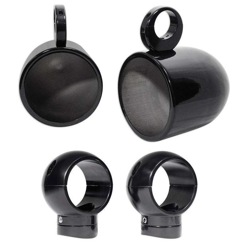 Sleek, strong, and ready for the water, this bundle pairs 8" black aluminum pods with MacSwivelB 360° clamps for precise placement. Internal wiring and sealed terminals deliver a refined look while protecting connections. Quick-release hand knobs make on-the-fly adjustments simple, and multiple inserts fit the most common bar sizes. Ideal for boats and powersports towers demanding bold sound and clean aesthetics.