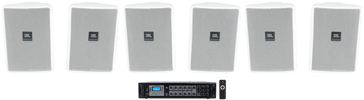 Deliver refined background audio across multiple areas with a sleek white aesthetic. The RCS180-6 amplifier manages six zones with modern connectivity, while compact JBL speakers provide clear, even coverage that complements contemporary interiors. Weather-ready construction and included hardware support reliable installation in cafes, boutiques, schools, and hospitality spaces.