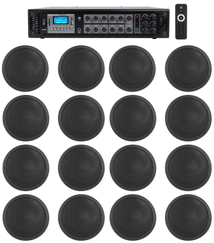 70V Ceiling Audio System, 6-Zone 180W, (16) 6" Black In‑Ceiling Speakers