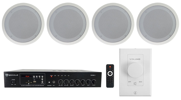 70V Ceiling Speaker Kit, 60W Amp, 4-Speaker Coverage, Wall Volume Control, Bluetooth, USB/SD