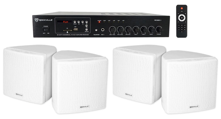 70V/100V Audio, 60W Amp, up to 4 speakers, Bluetooth, USB/SD, Includes amp, 2 pairs 3.5" white speakers