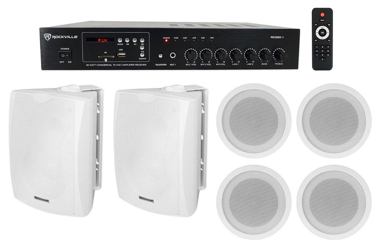 60W 70V Amplifier, (2) 6.5" IPX55 Speakers, (4) 5" Ceiling Speakers, Zone Ready