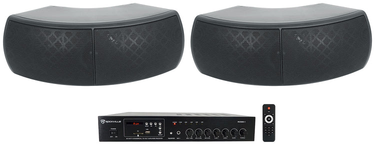 - Type Commercial 70V amplifier with dual‑driver outdoor speaker pair (black)