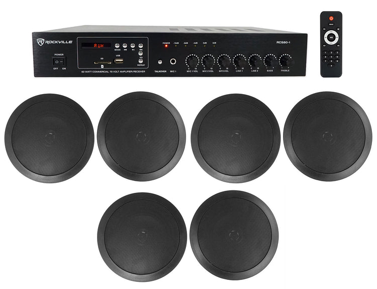 70V/100V Home Audio Style, 60W Capacity, Includes Amp, 6 6.5" Black Ceiling Speakers