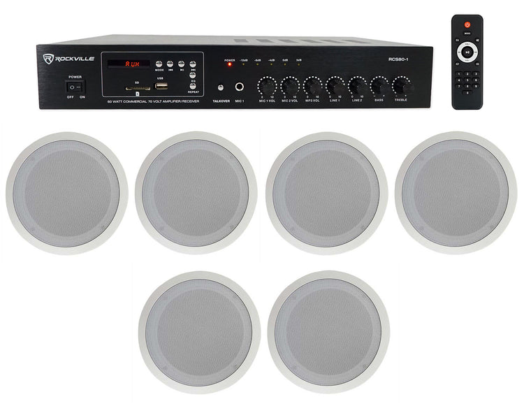Ideal for multi-room hospitality, boutique gyms, and studios, this curated package pairs a 60W 70V/100V amplifier with six 8" ceiling speakers for wide, even coverage. Select tap wattage per room to balance energy across active and quiet zones, then refine tone with bass/treble controls. Bluetooth, FM, and USB/SD inputs keep music flexible, while the minimalist white grills preserve an uncluttered aesthetic. The result is a composed, musical backdrop that flatters conversation and creates a welcoming, modern atmosphere.