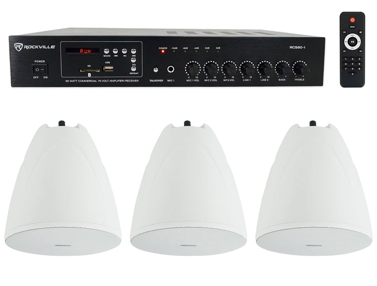 70V/100V Pendant Audio System, 60W Amp, Covers Small Venues, Includes 3 White 6.5" Pendants, Mounting Hardware