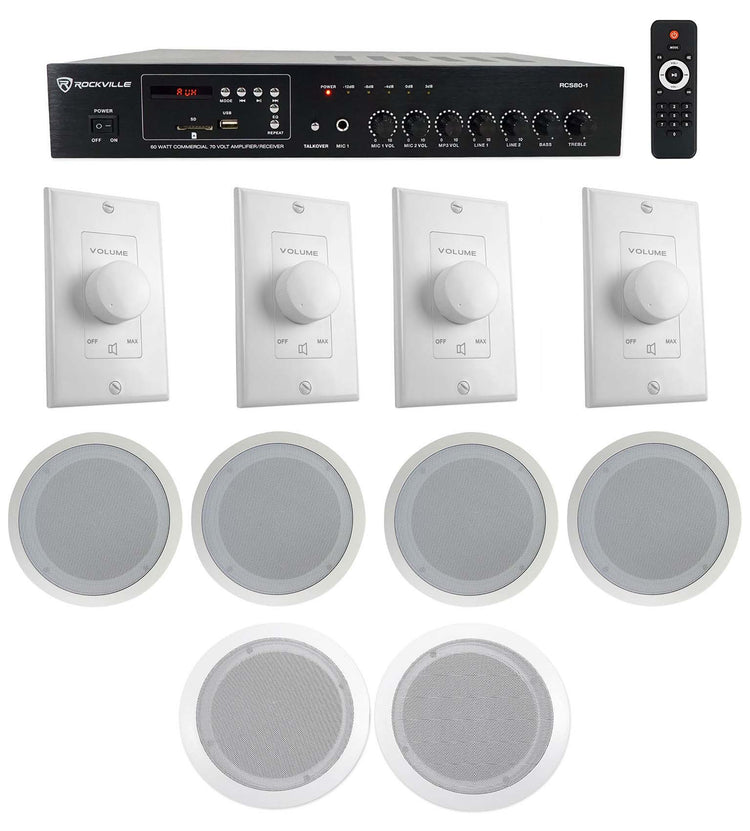 60W 70V Amplifier System, Multi‑Zone, (4) 35W Wall Controls, (6) Ceiling Speakers