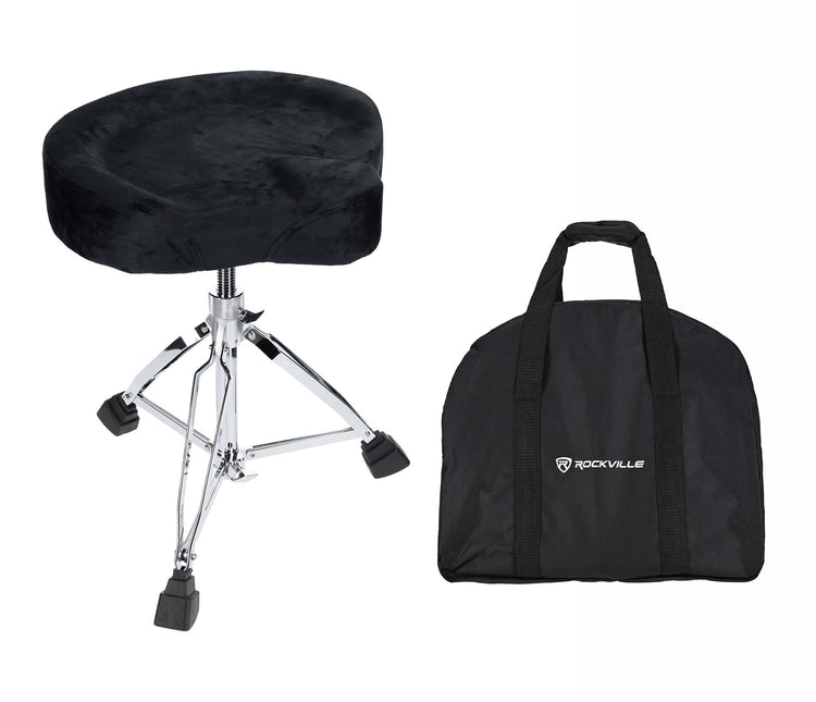 This double-braced drum throne delivers stable, customizable seating for practice, studio, and stage. The 4" memory-foam saddle seat offers plush comfort, while the 17.7"–23.6" height range fine-tunes posture. A tool-free locking mechanism prevents shifts in transit. Oversized rubber feet grip tight, and 1" steel tubing resists flex. Breaks down flat and packs into the included travel bag. Lockable collar lets you choose stationary or swivel motion for precise control. Velvet seat with vegan-leather accents pairs performance with understated style for a throne that looks sharp and feels composed through long sets.
