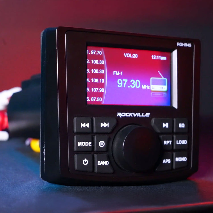 The Rockville RGHR45 is a marine-grade digital media receiver designed for seamless control and powerful sound across four independent zones. With a wired remote, you can adjust volume and playback from anywhere on your boat. The vibrant 3" TFT display, Bluetooth streaming, USB, and AM/FM radio offer versatile listening options, while the built-in amplifier delivers impressive volume and clarity. Engineered for marine environments, the RGHR45 boasts IP66 waterproofing, a humiseal-coated PCB, and robust construction. Quick to install and intuitive to use, it’s the ultimate upgrade for boaters seeking premium audio, convenience, and style.