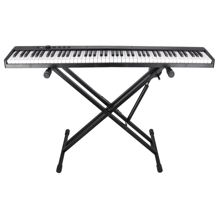 The Double X-style frame combines stability with weight distribution. Built to support keyboards up to 110 lb, this stand handles everything from MIDI controllers to 88-key digital pianos. Four rotating rubber feet compensate for uneven stage floors, outdoor surfaces, or sloped platforms, creating a level base in any environment.