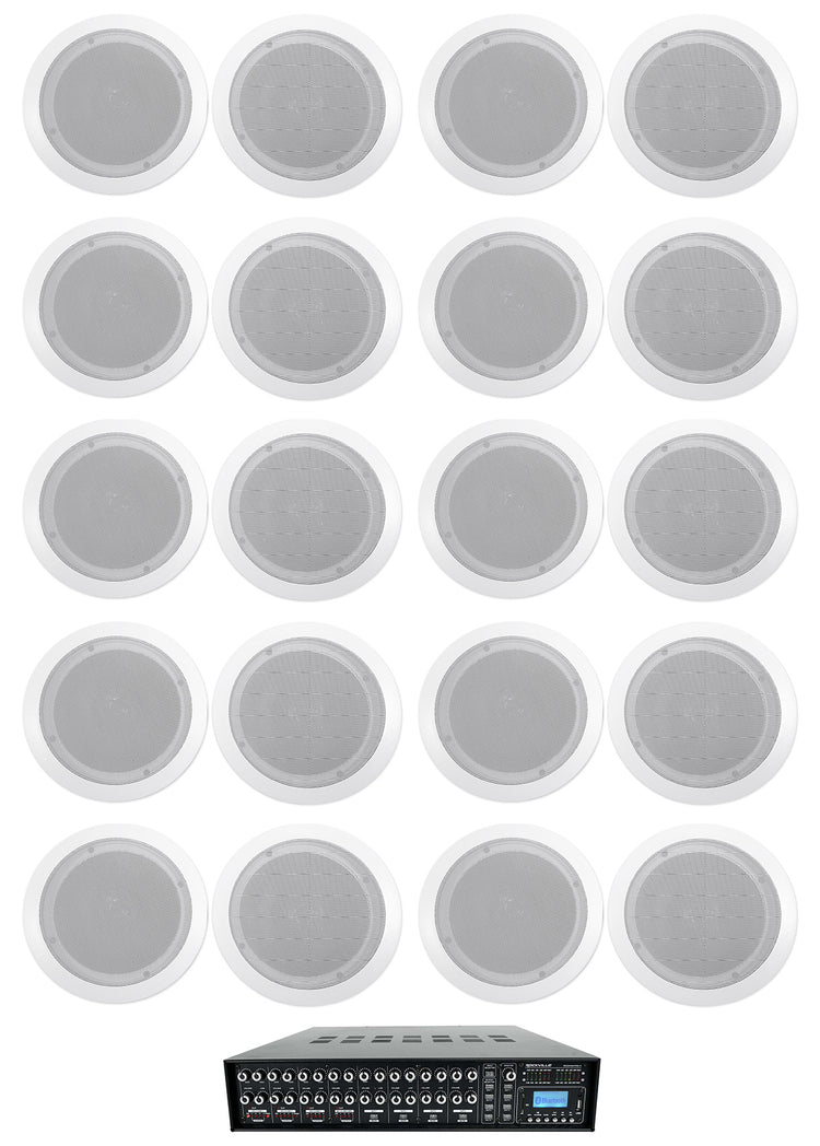 Elevate everyday audio with a refined multi‑zone backbone and twenty wide‑dispersion 6.5" ceiling speakers. This system brings smooth music reproduction and clear paging to restaurants, offices, schools, and hospitality spaces. With modern streaming, flexible inputs, and simple 70V wiring, it installs cleanly and scales gracefully as needs grow.
