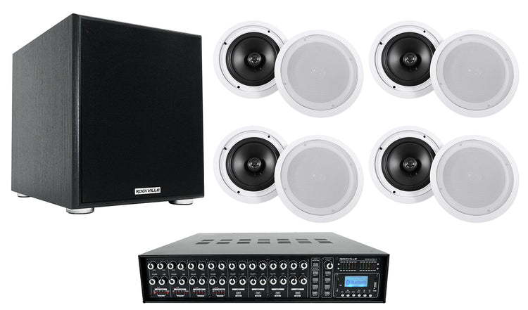 4-Zone 70V Matrix Amp, 8 In‑Ceiling 8", 10" Powered Sub, Bluetooth, USB, SD