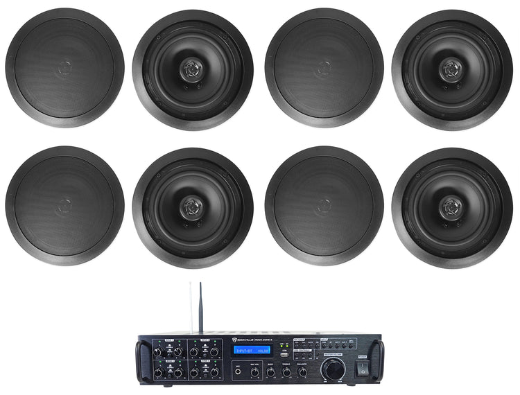 8" In‑Ceiling Speakers Black 8-Pack, 8‑Zone Receiver, Bluetooth, Rack Mount