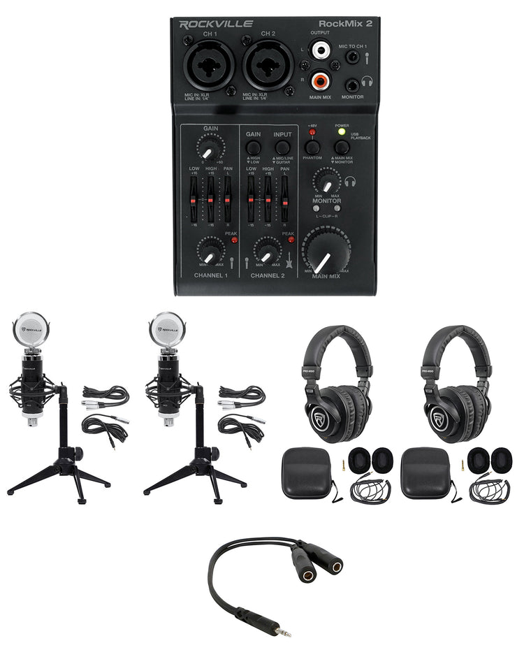 Launch a polished two‑voice podcast or interview rig. The RockMix 2 provides clean mic preamps, USB recording, 2‑band EQ, and switchable phantom power for both condensers. Cardioid capsules capture natural presence with reduced room noise, while closed‑back headphones keep monitoring precise. Compact desktop stands and a splitter cable round out an elegant, space‑saving setup for creators and classrooms.