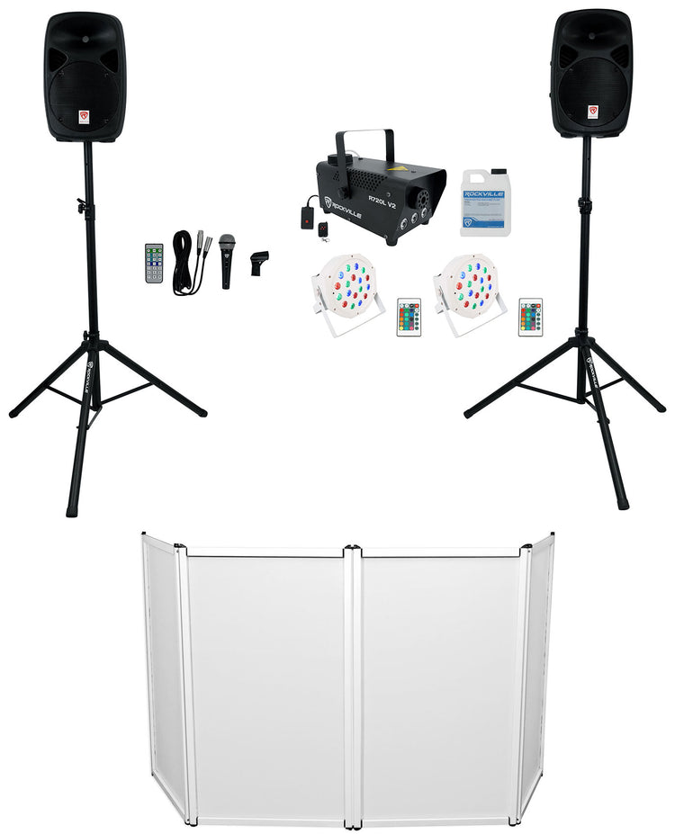 Dual 10" PA System, DJ Facade, Battery Uplights, LED Fogger, Stands, Mic, Cables