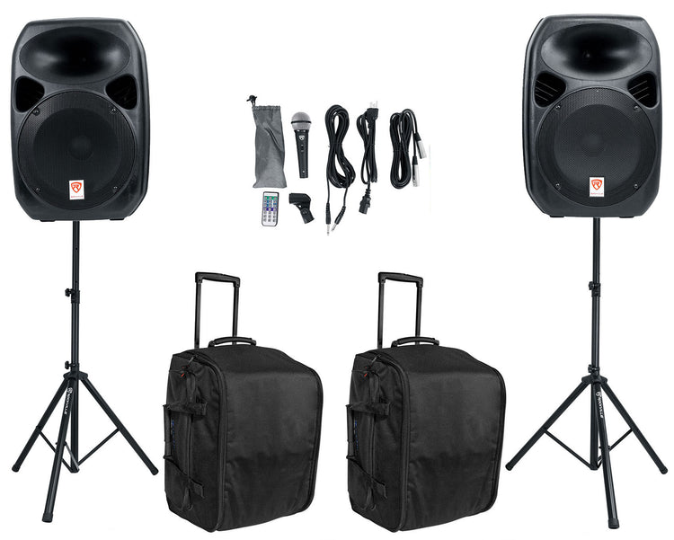 Dual 12" Powered System, (2) Rolling 12" Bags, Stands, Mic, Cables