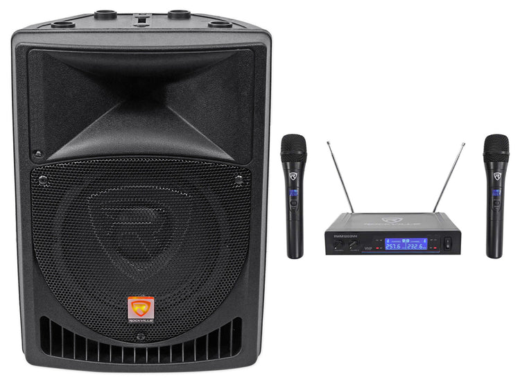 - Type Powered 8" PA with dual VHF wireless microphone bundle