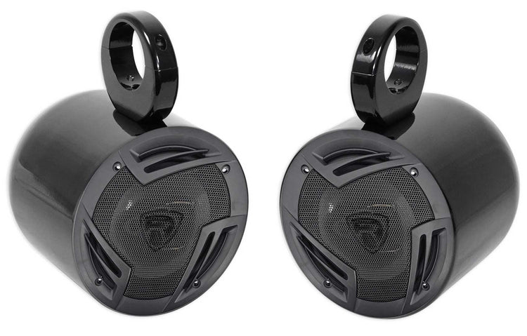 6.5" 3‑Way Speakers 140W RMS Pair, Black Aluminum Tower Pods, 2"–2.5" Clamps