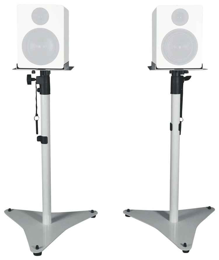 These adjustable studio monitor stands deliver stable height and tray width control for precise speaker placement in studios, offices, and living spaces. A solid steel, rounded-triangle base anchors your setup, while foam-padded, width-adjustable trays fit most bookshelf speakers up to 50 lb. Quick hand knobs simplify height and tray adjustments. Included rubber feet and carpet spikes tailor grip to any floor, and snap-on cable clips keep runs tidy. With clean white finish and confident stability, they refine desk space, improve imaging, and help your speakers perform at their best across creative and home audio environments.