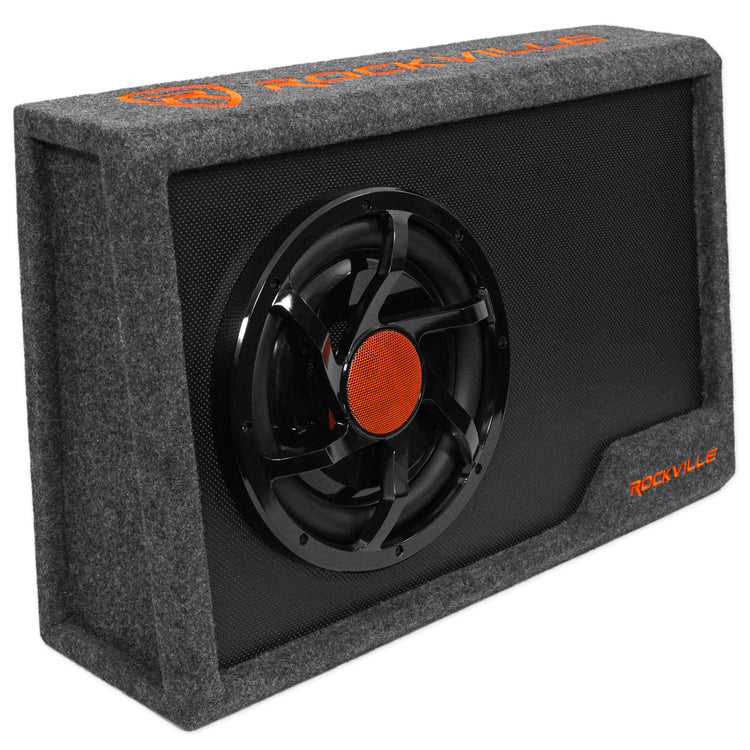 The Rockville RWS10CA delivers powerful, immersive bass in a compact, integrated package designed for any vehicle. This slim 10" powered subwoofer system combines a high-output subwoofer, sealed MDF enclosure, and a built-in 1000W amplifier for extraordinary sound. Engineered for easy installation, it features quick-connect inputs, molded terminals, and a remote bass control for precise tuning. Its sleek, space-saving design fits discreetly behind seats or in tight trunks, making it ideal for cars and trucks alike. Experience deep, resonant lows and dynamic performance—without sacrificing cargo space—with this all-in-one bass solution from Rockville.