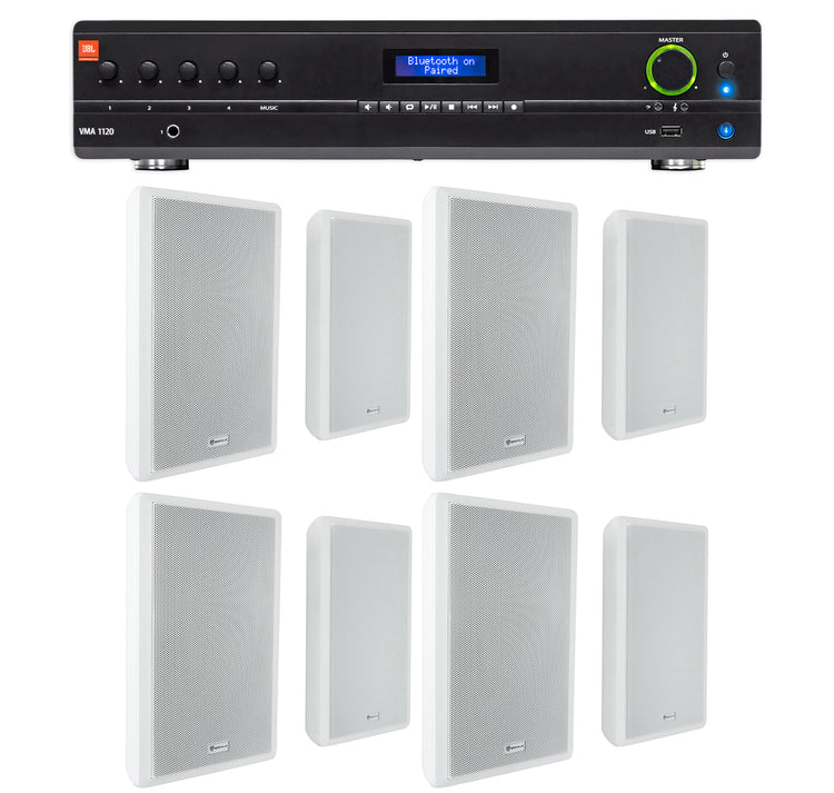 JBL Commercial Amplifier+(8) Slim White Wall Speakers for Restaurant/Bar/Cafe