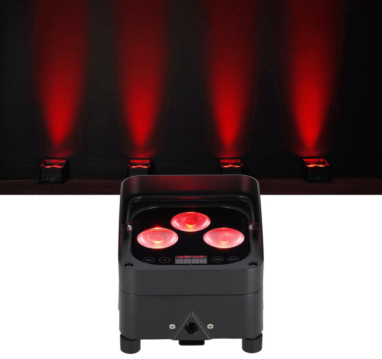 Compact Waterproof Par Light, Up to 25 Hrs of Battery, (3) 18 W RGBWA+UV LEDs, Wireless DMX, RF Remote
